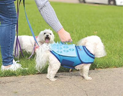 Louw’s Ruf protects a small dog in its vital areas—neck, back and stomach—and prevents serious injury from a dog attack. The multi-layered vest is constructed of materials that block teeth from penetrating; its spikes deter attackers and make jaw contact more difficult. A mesh pouch contains a bitter-flavored liquid that repels the attacker when pierced and encourages it to release the victim. The handle on the vest top assists the owner to quickly lift the small dog from danger.